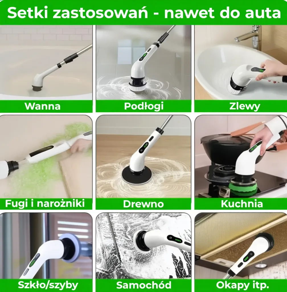 Idealna do blatów, zlewu, wanny, podłóg, szyb, a nawet felg i deski rozdzielczej. Dzięki wymiennym końcówkom dostosujesz szczotkę do każdej powierzchni bez ryzyka zarysowań.